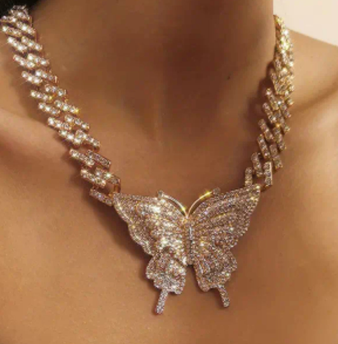 HIP HOP CUBAN STYLE GOLD RHINESTOE BUTTERFLY NECKLACE